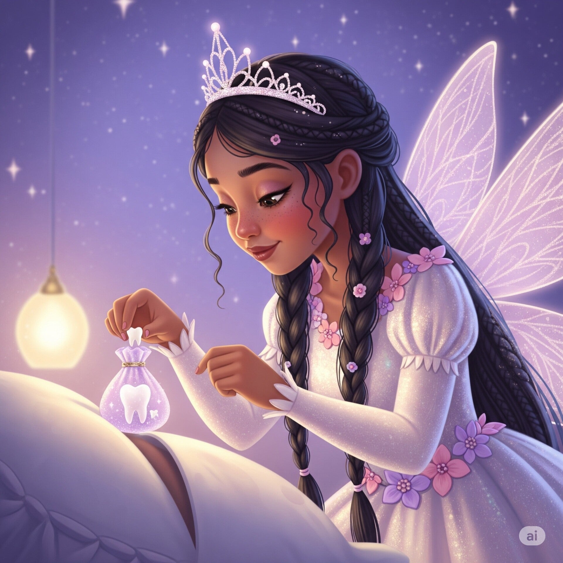 Mitten in der Nacht kam ein kleines, glitzerndes Licht durchs Fenster. Eine kleine Fee schwebte leise auf Jasmins Bett zu. Es war die Zahnfee. Sie lächelte und nahm den Zahn unter dem Kissen hervor. »Ein schöner Zahn!«, flüsterte sie. Ihre Stimme klang wie kleine Glöckchen. Dann legte sie ein kleines, glänzendes Päckchen unter das Kissen und verschwand so leise, wie sie gekommen war.